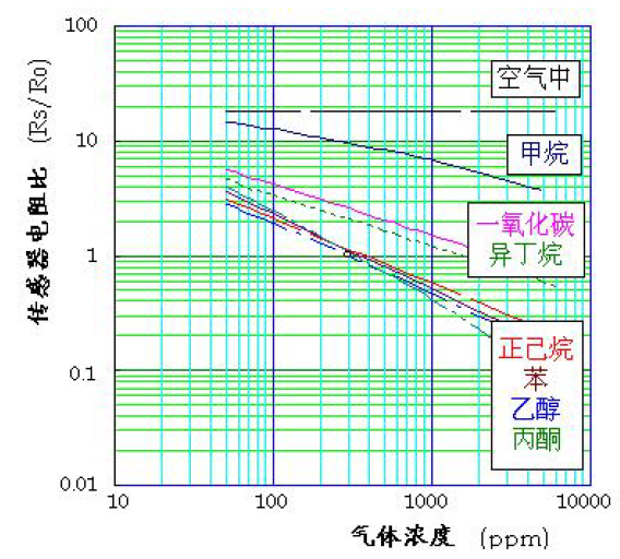 縱坐標(biāo)以傳感器電阻比(Rs/Ro)表示,Rs,Ro 的定義如下: