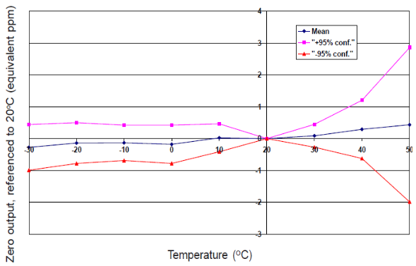 圖 2 顯示從溫度變化所引起的零點變化,以 ppm 表示, 參考 20 °C 時的零點 。 數(shù)據(jù)取自典型批次傳感器。