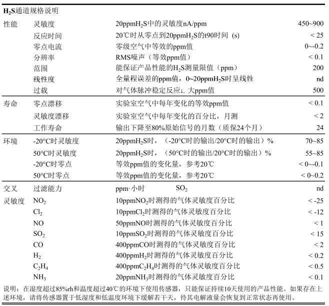 四、COH-A2 硫化氫傳感器的通道技術(shù)指標(biāo):