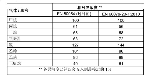 根據(jù) EN 50054(現(xiàn)已過時)和 EN60079-20-1:2010 中規(guī)定的 LEL 值,相關(guān)響應(yīng)數(shù)據(jù)顯示在下表中。