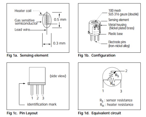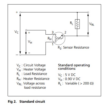 Fig2展示了此產(chǎn)品的標(biāo)準(zhǔn)使用電路。傳感器阻值(Rs)的變化導(dǎo)致了負(fù)載電阻(RL)上的電壓的變化。為了獲取最佳的性能和參數(shù),加熱電壓(VH),電路電壓(Vc)和負(fù)載電阻(RL)的值必須在給定的標(biāo)準(zhǔn)操作條件下的值,具體參數(shù)表在下一頁(yè)表述。