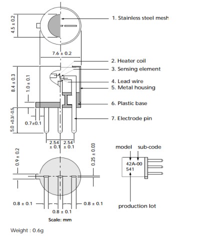 SB-42A是SnO2半導(dǎo)體氣體傳感器,對(duì)HCFS(如氟利昂R134a)有高靈敏度并且提高了抗其他氣體干擾的能力。此產(chǎn)品適合制冷劑氣體R134a,R-410a,R-407c的泄漏檢測(cè)。由于此產(chǎn)品的低功耗(120mW)特點(diǎn),非常適合便攜式設(shè)備。 結(jié)構(gòu) 氣體感應(yīng)半導(dǎo)體材料是小珠子的類(lèi)型,加熱線(xiàn)圈和電極線(xiàn)嵌入在元件中。敏感元件安裝在金屬封裝內(nèi),此封裝是用可以空氣流通的雙不銹鋼網(wǎng)眼制成。此網(wǎng)眼具有防爆特性(Fig1)。