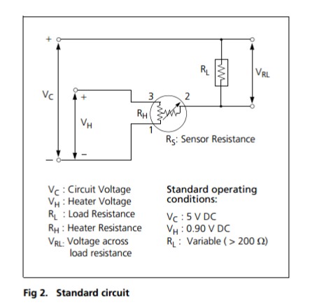 Fig2展示了此產(chǎn)品的標(biāo)準(zhǔn)使用電路。傳感器阻值(Rs)的變化導(dǎo)致了負(fù)載電阻(RL)上的電壓的變化。為了獲取最佳的性能和參數(shù),加熱電壓(VH),電路電壓(Vc)和負(fù)載電阻(RL)的值必須在給定的標(biāo)準(zhǔn)操作條件下的值,具體參數(shù)表在下一頁表述。
