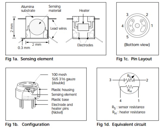 氣體感應(yīng)半導(dǎo)體材料緊貼在鋁基片上,金電極打印在基片上。氧化釕的薄加熱器打印在基片的背面,并且放在塑料封裝中(Fig1)。