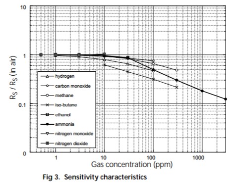 Fig2展示了此產(chǎn)品的標(biāo)準(zhǔn)使用電路。傳感器阻值(Rs)的變化導(dǎo)致了負(fù)載電阻(RL)上的電壓的變化。為了獲取最佳的性能和參數(shù),加熱電壓(VH),電路電壓(Vc)和負(fù)載電阻(RL)的值必須在給定的標(biāo)準(zhǔn)操作條件下的值,具體參數(shù)表在下一頁表述。