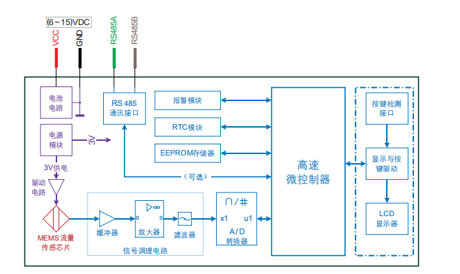 該流量計同時實現(xiàn)熱源的產(chǎn)生與溫度的測量。當(dāng)芯片處于工作狀態(tài)時,在傳感器的周邊形成穩(wěn)定的溫度場分布。一旦一定質(zhì)量的氣體流過傳感器時,氣體的流動將破壞該溫度場的分布,形成特定的、取決于該氣體的質(zhì)量和速度的溫度場分布。微機(jī)電系統(tǒng)流量計芯片上的傳感器將測量這一變化并把這一變化轉(zhuǎn)換為電信號,由一個專門的電路變送器對此信號進(jìn)行放大、調(diào)理并作線性化處理。由于不同質(zhì)量的氣體對傳感器的周邊形成穩(wěn)定的溫度場分布所產(chǎn)生的擾動不同,因而能測量氣體的質(zhì)量流量或總流量。下圖為該系列流量計的原理框圖。