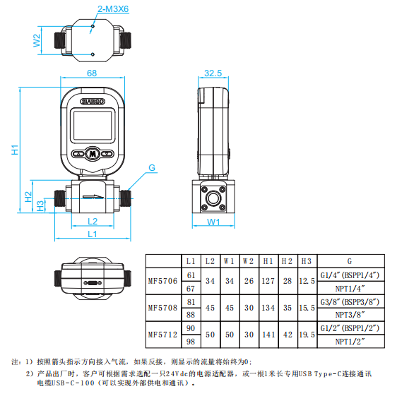 五、美國SiargoMF5700系列便攜式氣體質(zhì)量流量計 產(chǎn)品結(jié)構(gòu)與機(jī)械尺寸: