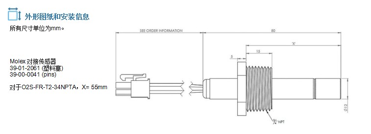 英國SST 氧化鋯傳感器 O2傳感器 NPT探頭系列 螺紋安裝外殼 O2S-FR-T2-34NPTA-XXX 尺寸: