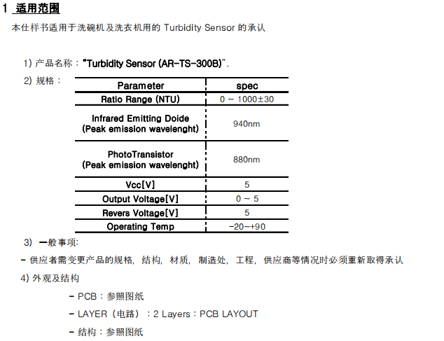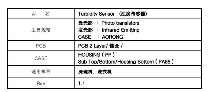 主要用于洗衣機(jī)、洗碗機(jī)等產(chǎn)品的水污濁程度的測量,通過把水的污濁度轉(zhuǎn)換為0~5V的模擬電壓輸出來表示所洗物品潔凈程度,從而實(shí)現(xiàn)智能洗滌。