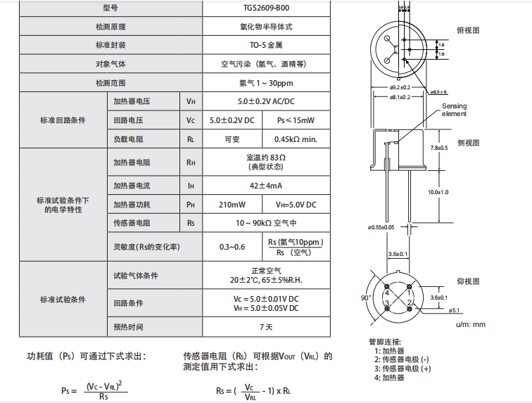 TGS2609-B00對(duì)極其微弱的空氣污染氣體具有很高的靈敏度。像香煙煙霧中存在的氫氣或一氧化碳,此傳感器可檢測(cè)到幾個(gè)ppm的氫氣。由于實(shí)現(xiàn)了小型化,加熱器電流僅需42mA,外殼采用標(biāo)準(zhǔn)的TO-5金屬封裝。