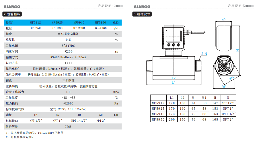 美國Siargo 流量傳感器 MF5900系列 參數(shù):