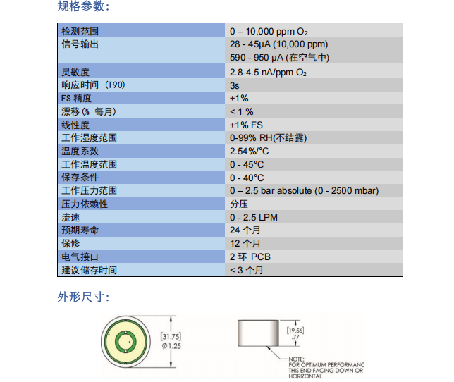 美國(guó)AII PPM O2 氧氣傳感器 微量氧傳感器?GPR-12-333-H 參數(shù):