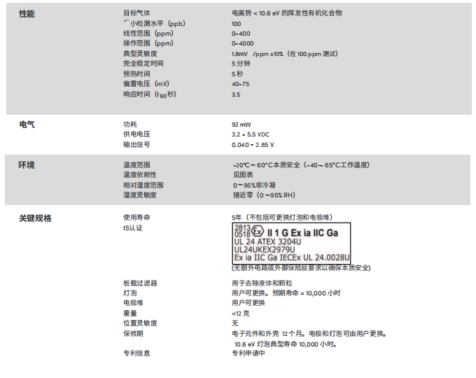 英國(guó)Alphasense VOC 光電離子傳感器 高級(jí)PID傳感器 – PIDX-A-04K 參數(shù):