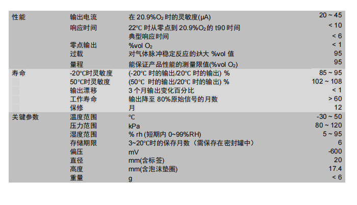英國Alphasense O2 長壽命無鉛氧氣傳感器 LFO2-AL 參數: