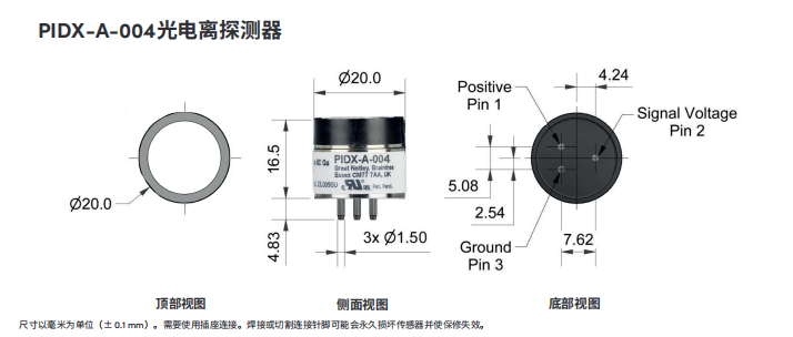 英國Alphasense VOC 光電離子傳感器 高級PID傳感器(0-4ppm)– PIDX-A-004尺寸: