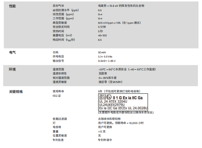 英國Alphasense VOC 光電離子傳感器 高級PID傳感器(0-4ppm)– PIDX-A-004 參數(shù):