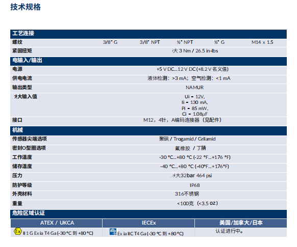 Ex ia IIC T4 Ga –30°C 至 +80°C (-22 °F…+176 °F)