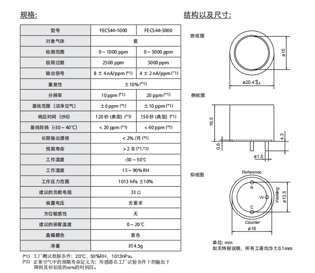 日本figaro 用于檢測高濃度氨的氣體傳感器 FECS44-5000 參數(shù):
